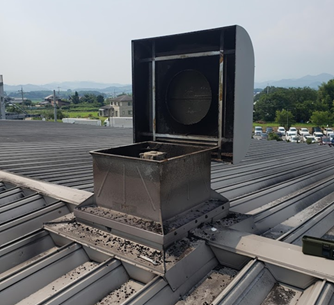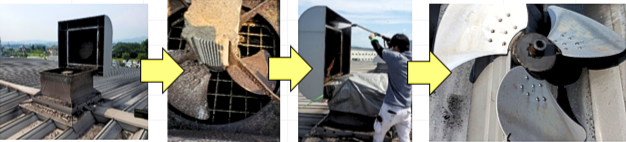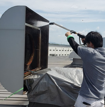 除塵清掃や設備の分解洗浄作業 食品工場での高所に堆積した粉塵等が商品へ混入することによるクレームを防ぐため高所清掃機材を駆使し、除塵清掃を行ったり、高所に設置された大型換気扇の分解洗浄等、様々な難清掃箇所の清掃作業を行っております。